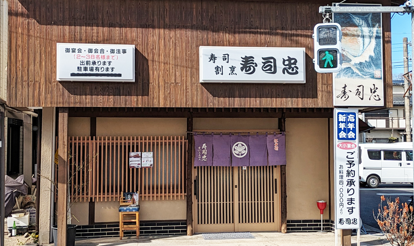 東京都青梅の旧青梅街道沿いにある寿司屋。2階建てで2階では座敷があり、宴会などにも使用可能。
